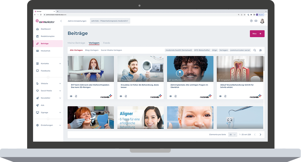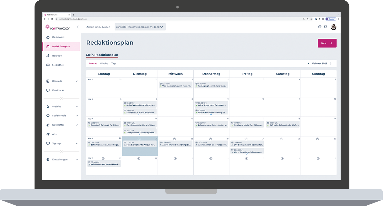 - Fachinhalte auf deinem Praxisblog in einem Redaktionsplan einplanen, und automatisch veröffentlichen kannst. Dadurch erhöhst die Sichtbarkeit deiner Praxis und sorgst für eine umfassende Patient:innenaufklärung.